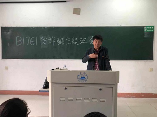 会后,夏启国来到联系的土木工程B1761班,和同学们一起参加了防诈骗主题班会。听完班主任郭军与同学们的防诈骗案例讲解和宣传后,夏启国根据自己的亲身体验谈了一些防诈骗的感言,提醒同学们要守住“切莫贪小便宜”、“天上不会掉馅饼”的准则,谨防各类诈骗陷阱。