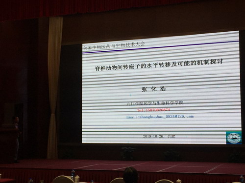 本次全国生物医药与生物技术大会是在各国加大生物经济研发投入、前沿生物技术频现突破、颠覆性成果不断涌现、生物技术产业正加速成为继信息产业之后又一个新的主导产业的前提下,聚焦生物医药与生物技术协同发展,科技服务产业,旨在打造国际科技核心竞争力和产业优势。南京师范大学生物医药功能材料国家地方联合工程研究中心主任沈健教授、江南大学粮食发酵工艺与技术国家工程实验室副主任刘立明教授、暨南大学抗体工程研究中心副主任邓宁教授、西北大学生物医药研究院院长范代娣教授等全国生物医学材料、生物发酵工艺方向10多位知名专家参加大会,并作精彩的学术报告。我校张化浩博士作了《脊椎动物间转座子的水平转移及可能的机制探讨》的大会交流报告。