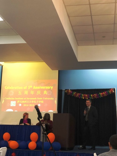 萨凡纳-查特姆郡公立学校系统(SCCPSS)成功举办了盛大的五周年系列庆祝活动。美国外交界代表、佐治亚州政府代表、商界代表、教育界代表,以及萨凡纳州立大学师生员工、当地公立中小学师生员工和学生家长、社区市民、兄弟孔子学院代表等,共计1500余人次参加了本次庆祝活动。美国驻利比里亚共和国前大使、非洲事务前助理国务卿琳达·汤姆斯-格林菲尔德女士(Linda Thomas-Greenfield),利比里亚共和国驻佐治亚州名誉总领事辛西娅·布兰福德女士(Cynthia Blandford),佐治亚州政府经济发展署中国事务执行总监、中国首席代表徐思行女士(Stella Xu),美国商务部对外商务服务署驻上海机构负责人保罗·斯文森先生(Paul H Swenson)等各界人士出席了论坛并作了精彩演讲。出席庆祝活动的还有:萨凡纳-查特姆郡教育局语言项目负责人马克·林斯基博士(Mark Linskey),萨凡纳州立大学国际教育中心负责人乔琳·基维女士(Jolinekeevy)女士、图书馆负责人路易斯·威奇(Louise Wyche),阿拉巴马农工大学孔子学院外方院长王勇博士、中方院长喻惠群博士,亚特兰大孔子学院外方院长蔡荣博士、中方院长陆小兵博士,卫斯理安孔子学院中方院长刘会春博士等来自各方的嘉宾。