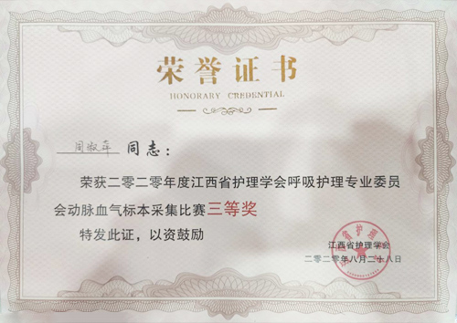 8月28日,由江西省护理学会呼吸护理专委会举办的“动脉血气标本采集”大赛在南昌大学第一附属医院圆满落幕。此次大赛有全省22家地市级医院共22位优秀选手参加,经过4个多小时的激烈角逐,我校附属医院呼吸二科护士周淑萍荣获此次大赛三等奖。