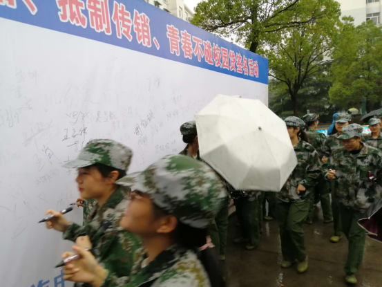 为强化新生安全意识,10月15日下午,学校保卫处、学生处联合九江市濂溪区公安分局反诈中心、濂溪区市监局十里分局、濂溪区禁毒办、濂溪区公安分局十里派出所在学校三食堂开展了“反诈骗、禁毒品、抵制传销、青春不碰校园贷签名活动”。