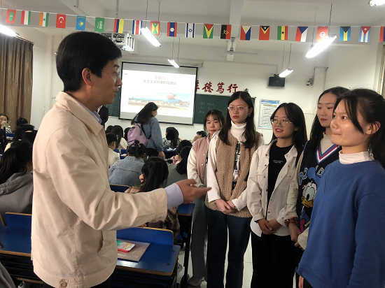 查振华先后进入外国语学院A2035/A2041班听取了马克思主义学院卢小池老师讲授的《思想道德修养与法律基础》和A1911/A1912班邝铁宝老师讲授的《毛泽东思想和中国特色社会主义理论体系概论》,他对卢小池老师的课程结构、知识广度和邝铁宝老师的课程信息量、课程设计等方面分别给予了充分的肯定,并勉励两位老师要充分发挥自己多年的从教经验优势,创新教学模式,活跃课堂气氛,最大化提高学生对课堂知识的理解度和接受度。