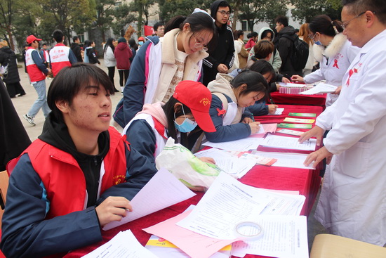 活动现场,校医院、濂溪区疾控中心工作人员和唯医服务队志愿者们在胸前佩戴红丝带,向师生提供志愿咨询服务、知识讲解、开展问卷答题、发放宣传材料、抱抱感染者玩偶、发放安全套、动员并提供艾滋病筛查检测、爱心留言和承诺签名等,同学们踊跃参与,气氛热烈。