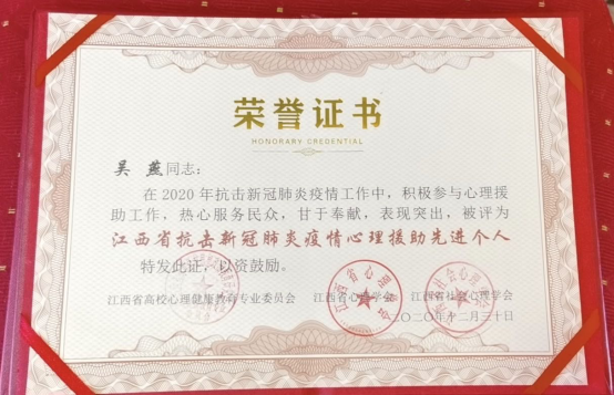 教育学院教师喜获“江西省抗击新冠肺炎疫情心理援助先进个人”称号