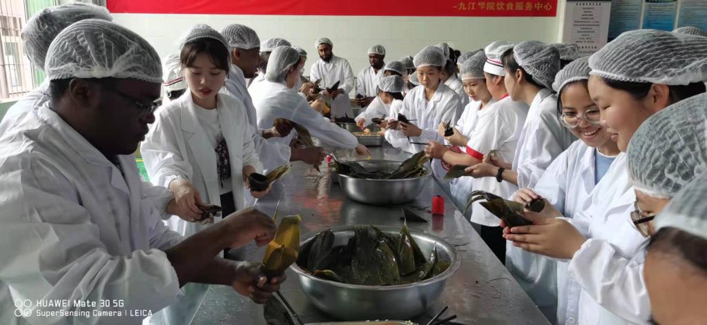 来自国际交流学院的5名留学生也兴致勃勃地参与了活动,认真地体验了一次中华文化。现场气氛十分活跃热闹。在欢快的氛围中,煮熟的粽子出了锅,甜的、咸的,方的、圆的,大家纷纷开始品尝自己的劳动果实。简单的一次包粽子活动,不仅是饮食中心全体员工送出的一份浓浓端午情,不仅能有效帮助食堂提升服务质量和服务品质,还共同促进了和谐文明美丽校园建设,更是后勤管理处“为师生办实事”的一份心意。