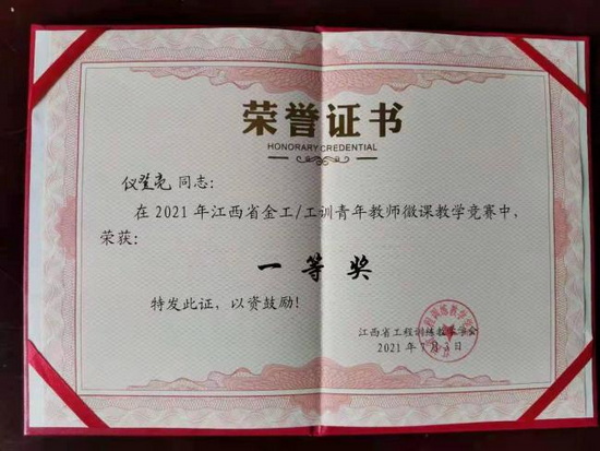 为进一步提升江西省金工和工训教师的教学能力和业务水平,并向全国金工和工训青年教师微课竞赛推荐优秀选手,7月2日-4日,2021年江西省金工与工训青年教师微课教学竞赛在南昌航空大学举行。我校机械学院教师仪登亮参加了本次竞赛,并获得了一等奖的优异成绩。