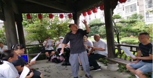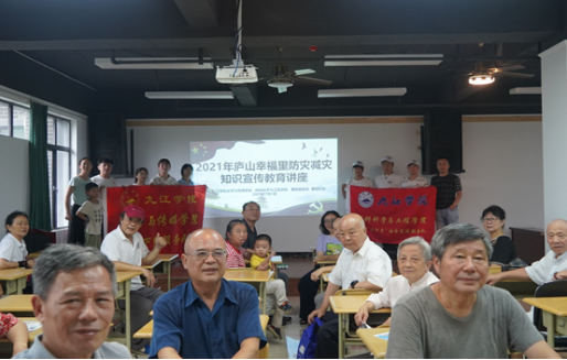 队员们跟随着庐山幸福里颐养尊老社区负责人的脚步,来到了正在为庆祝中国共产党成立一百周年献唱爱国爱党歌曲的老人们中,与他们共同欢唱了《我和我的祖国》《五星红旗迎风飘扬》《没有共产党就没有新中国》等歌曲;在老年活动中心,队员们通过讲解防灾减灾PPT、发放防灾减灾知识宣传手册,带领到场的老人们一起学习相关知识,宣讲后还进行了防灾减灾知识有奖竞答活动。