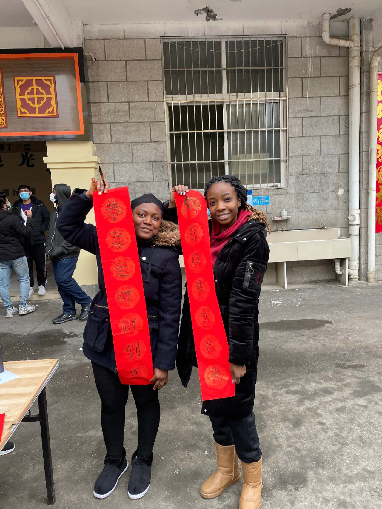 为了使留学生体验中国春节文化,国际交流学院还安排留学生学写春联。同学们积极参与,一笔一划,认真细致,不少同学写完后还不忘“秀”一下。学校还为留学生准备了新年礼物,领到礼物的同学兴高采烈,脸上洋溢着兴奋的笑容。
