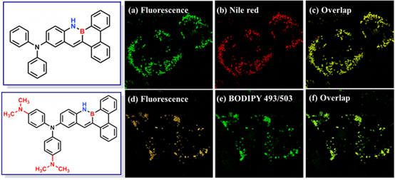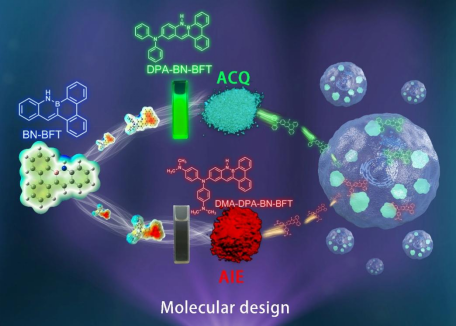 据悉,这是首次在同一有机硼氮骨架上仅通过取代基的细微调控,就能实现母体骨架发光性质从ACQ到AIE的精准调控,同时,机理研究表明分子堆积方式和作用力不同是导致这两类分子具有不同发光行为的主要因素,为后期进一步开发具有新性质和新功能的硼氮功能分子提供了一定的理论依据。更为重要的是,深入研究表明这两类分子可专一识别定位人体乳腺癌中的亚细胞器脂滴,对其他细胞器无任何识别作用,有望在癌症的诊断和治疗等领域得到更进一步的应用。
