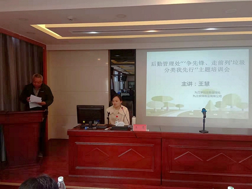 为深入贯彻落实《江西省生活垃圾管理条例》规定要求,进一步加强美丽校园建设,提高校园文明程度,推进后勤精细化管理,3月10日上午,后勤管理处在濂溪宾馆二楼会议室举行了“‘争先锋、走前列’垃圾分类我先行”主题培训会。培训会特邀九江市垃圾分类领导小组办公室工作人员王慧 、何平桃、高乾翔到我校开展专题培训工作。