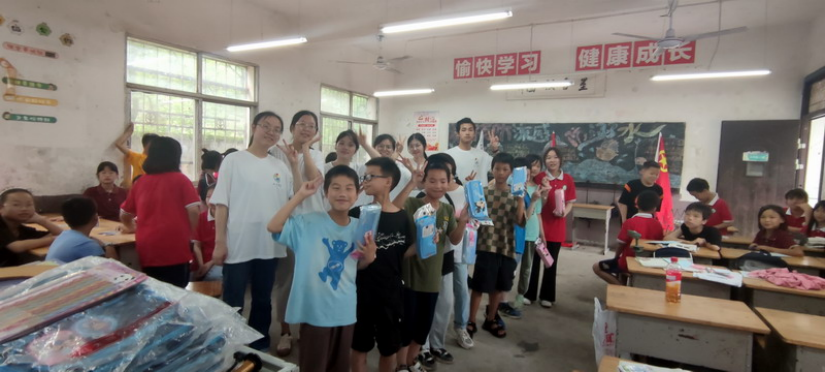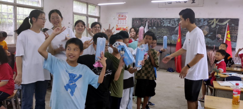 队员们还与留守儿童们一同游戏,通过文体活动向留守儿童们传递温暖。合唱《孤勇者》歌声响遏行云,稚嫩的嗓音中凸显了同学们的真诚和活力,高亢激昂的歌曲也让同学们的羞涩和胆怯退却;纸牌叠高小游戏鼓励同学们一同参与活动,积极交流合作,让他们明白了众人拾柴火焰高的道理;萝卜蹲游戏,同学们在游戏中玩得不亦乐乎,偶尔的犯错活跃了现场气氛;投壶小游戏中,孩子们为每一次投中欢呼鼓喝彩,也会为没中的同学鼓掌勉励。活动结束后,队员们还向孩子们赠送了文具、书籍、书包等用品,孩子们的脸上洋溢着灿烂笑容。