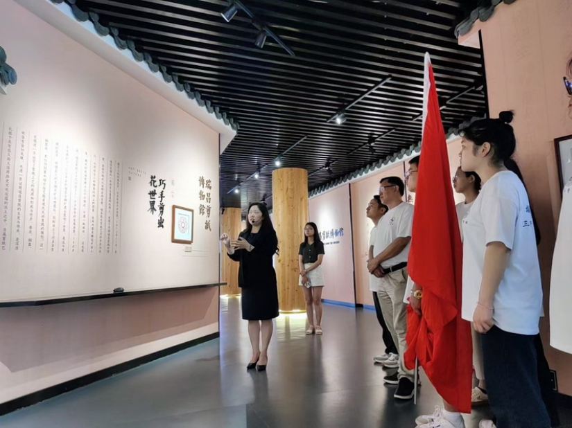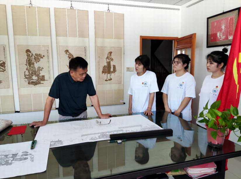 剪纸艺术是人类非物质文化遗产的代表作之一,瑞昌夏畈镇是著名的剪纸之乡。服务队一行来到九江市首家非物质文化遗产专题博物馆——瑞昌剪纸博物馆参观学习。解说员分别从“精工溯源、以梦荟艺、文脉传承、致敬瑞昌手艺人、又见绝艺、剪纸殿堂”六个主题介绍了瑞昌的剪纸历史足迹和当今发展传承情况,并介绍了优秀剪纸作品的内涵。尤其是博物馆增设的“党史文化板块”,从60余名艺人创作出的100余幅作品中,挑选出20余幅构思精巧的剪纸作品进行展览,用获国家专利的光影镂空装裱技艺进行创作的红船精神、井冈山精神、长征精神、西北坡精神和延安精神剪纸作品细腻精美,选取共产党长征路上在瑞金发生的有代表性的75双草鞋、一盏马灯、一艘渔船的党史故事剪纸作品意境深远;以九江甘棠湖小划子会议、毛主席在广州农民教习所演讲、毛主席创作的《送瘟神》诗两首等为创作背景的剪纸作品生动形象。同学们聆听剪纸故事,接受党史教育,对剪纸有更加明确的认识和了解。参观结束后,队员们又采访了朱朴老师,他说:“剪纸是我们瑞昌的国家级非物质文化遗产,是我们这里的特色,剪纸结合党史让我们党史学习教育更加‘鲜活’。”