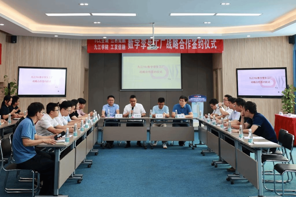 签约前,参会人员共同参观了TCL空调器(九江)有限公司的联合数字孪生实验平台、人工智能仓、配送数控平台、工厂车间等地,详细了解了TCL空调器(九江)有限公司的发展历程、运营情况、生产工艺、技术创新等方面的内容,并对企业现有数字化程度及后续升级转型规划进行探讨。