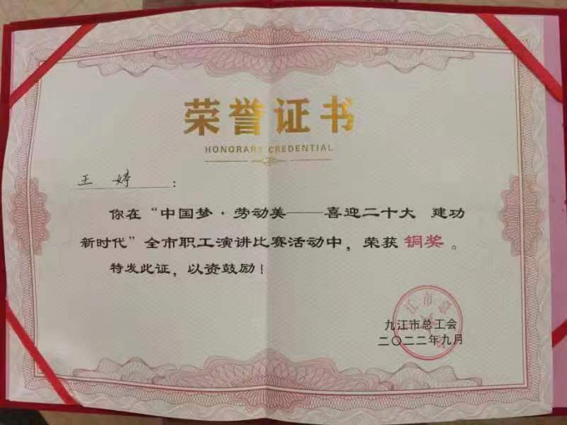 近日,由江西省九江市总工会主办、九江市工人文化宫承办的“中国梦·劳动美——喜迎二十大 建功新时代”全市职工演讲比赛(决赛)举行。我校选派的建筑工程与规划学院的王婷老师参加本次比赛,并荣获铜奖。