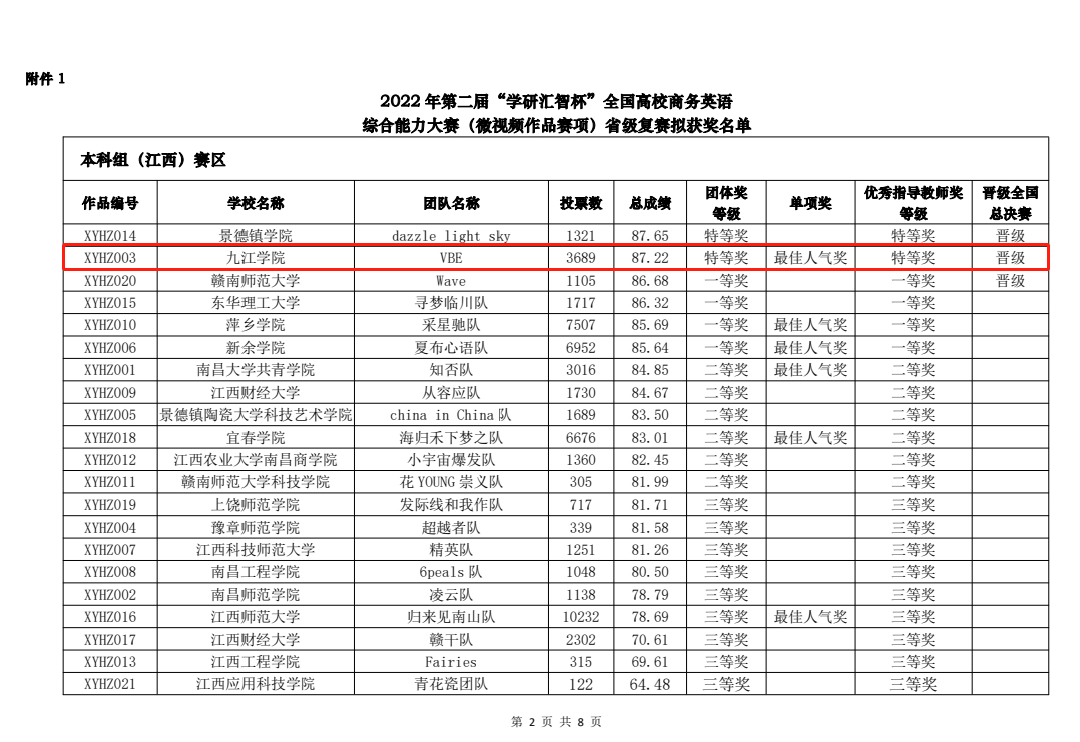 10月8日,第二届“学研汇智杯”全国高校商务英语综合能力大赛(微视频作品赛项)复赛微视频作品评比和线上投票圆满结束。经专家评审,全国最终有135支参赛队成绩有效,我校外国语学院商务英语VBE团队作品“爷爷的茶”获江西赛区本科组特等奖和最佳人气奖,晋级全国总决赛,取得参赛以来最佳成绩。