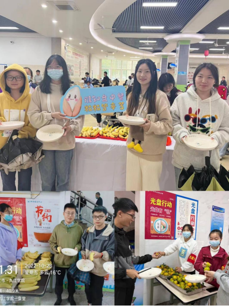 “同学!一起光盘,不要浪费哈。”在九江学院学生食堂,服务人员在一旁温馨提醒同学们节约粮食,不要浪费。10月27日至31日,我校后勤管理处积极开展“光盘行动”,将光盘有“礼”与校运动会有机结合,在全校师生中发起了“厉行节约 反对浪费”的倡议。走进食堂,同学们惊喜地发现,自己“光盘”后收到了一份新鲜的小礼物:一根香蕉或一个桔子。在教职工餐厅,正在取餐的李娟老师说:“践行‘光盘行动’,教师也要以身作则。”