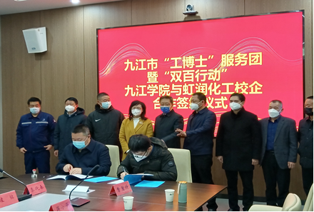 我校占昌朝教授、胡华南博士分别与江西虹润化工、江西海多有机硅签订九江市“工博士”服务团暨“双百行动”三方协议书;闵欣博士、曹重仲博士分别代表课题组与江西虹润化工签署了《技术转让(专利权)合同》(转让费15万元)及《氯磺化聚乙烯合成溶剂替代项目》等项目合同(经费30万元)。