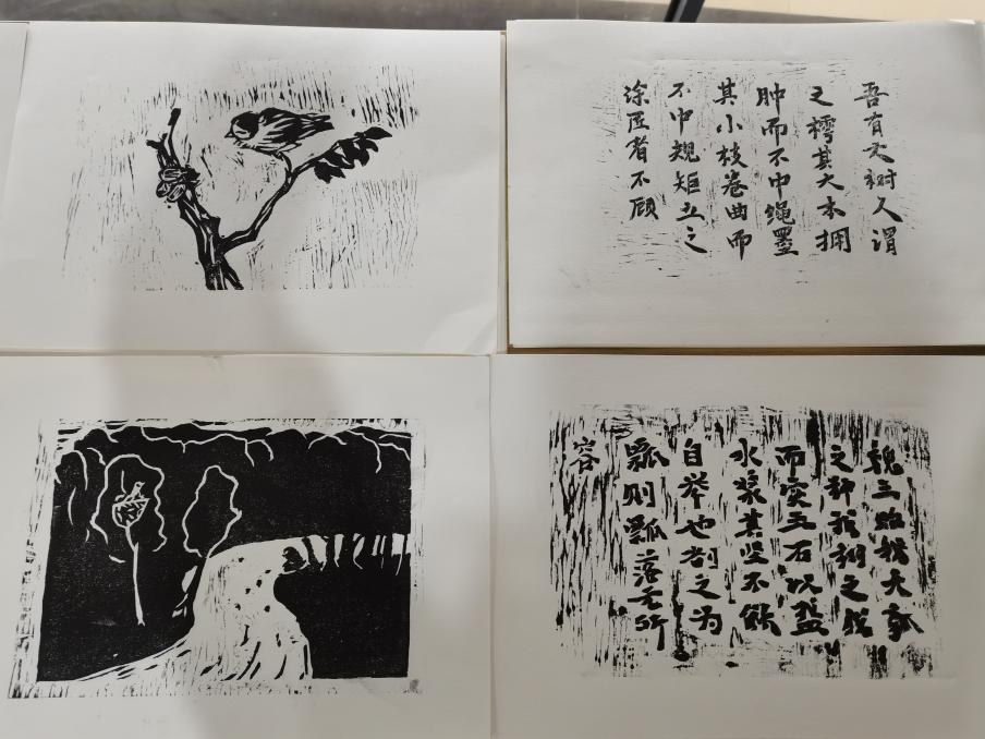 植物拓印是中国非物质文化遗产的重要组成部分,蕴含着独特的文化内涵和精神价值。虞婷老师介绍道:“世界读书日期间,图书馆“见琢”版画工坊继续推出“刻印经典”手工版刻典籍活动。今年挑选了《庄子》内篇中一些饶有意趣的篇目,结合其相关插图,邀请同学参与到雕版印刷和手工装帧的过程中。”