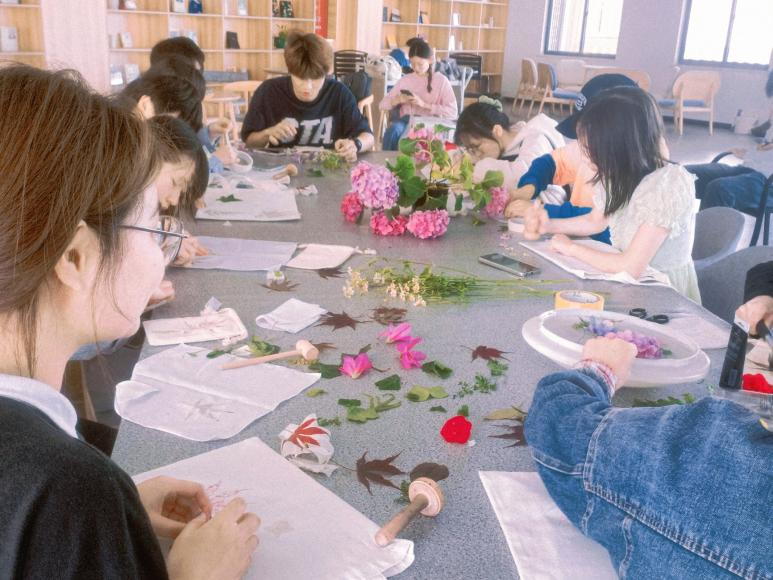 植物拓印、版刻典籍体验中华传统技艺  4月15日下午,主图213多功能厅里传来一阵敲击声和讨论声。原来是同学们正在参加图书馆“留住春天”植物拓印手工活动。寻常的叶、朴素的花,经过同学们的创意组合,在物理敲击下形成了各种图案,像一件精美艺术品。