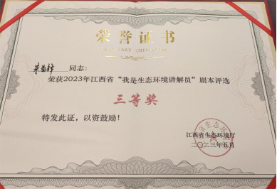 5月19日,由江西省生态环境厅主办的江西省2023年“我是生态环境讲解员”选拔赛决赛在省生态环境厅成功举行。我校资源环境学院的程曦同学从预选、初赛中脱颖而出,并在决赛中发挥出色,荣获2023年江西省“我是生态环境讲解员”选拔赛二等奖,并将作为参加生态环境部比赛的候补人选参加后期培训;同时,资源环境学院的钟锦绣、张天翔、朱益锋同学还荣获优秀剧本三等奖2项。