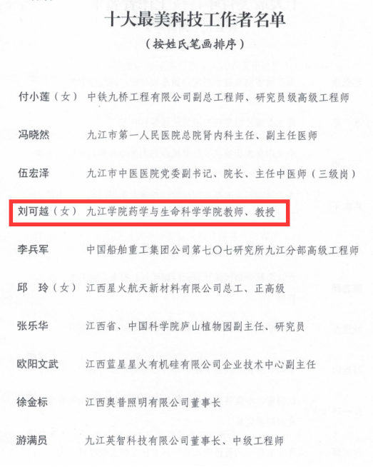 近日,从中共九江市委人才工作领导小组办公室、九江市科学技术局、共青团九江市委、九江市科学技术协会联合下发的《关于选树2023年九江市“十大最美科技工作者”“十大最美青年科技工作者”“十大最美科普工作者”的决定》中获悉,我校药学与生命科学学院教授刘可越获评2023年度九江市“十大最美科技工作者”称号,材料科学与工程学院副教授姚海龙、九江学院附属医院主治医师陈志颖获评2023年度九江市“十大最美青年科技工作者”称号。我校教师获此殊荣,充分体现了市委市政府对我校科技与社会服务工作的肯定。