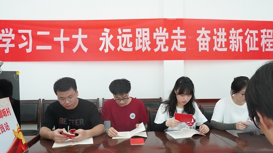 学习党的精神,传递青春力量。一走进谭畈村新时代文化实践站,“全面深入学习贯彻党的二十大精神”的展板便映入眼帘,展板以图文并茂的形式介绍了党的二十大,回顾党的光辉历程,宣传党的二十大精神,同时也吸引“文小青”队员们纷纷驻足观看学习。