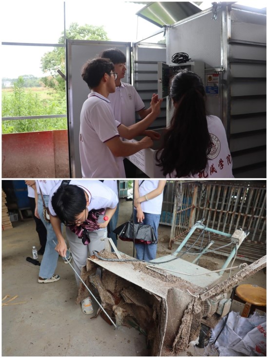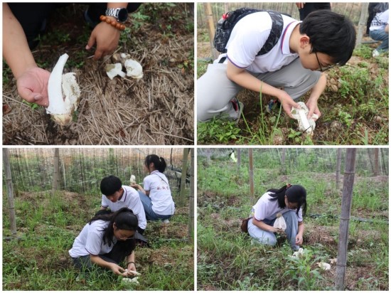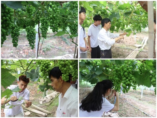 在高垄乡双垄村竹荪种植基地,在负责人邓经理的带领下,实践队员们认真学习竹荪种植的基本原理和土壤湿度等环境处理的操作要领以及采摘技巧,并动手采摘;参观竹荪加工生产车间,了解有关竹荪烘干机的构造、原理以及操作方法和注意事项还有农业机械的使用情况。在阳光玫瑰葡萄园内,负责人曹经理介绍了葡萄产量并演示如何疏果,负责修剪的张师傅普及了修剪枝条标准。随后,实践队员们便开始修剪枝条和疏果。劳动后,队员们还一起研讨了如何结合九江市“山江湖城”发展进行机械创新大赛设计,特别是采摘设备的技改问题。