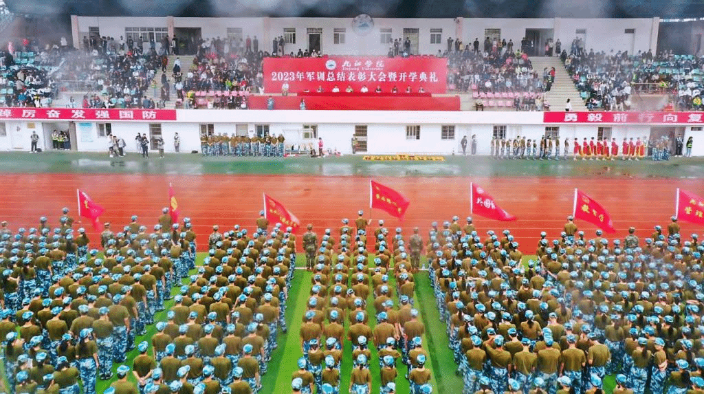 9月23日上午,在主校区南区运动场,随着军训总结表彰大会的圆满落幕,九江学院8500余名大一新生正式结束了为期14天的军训训练。