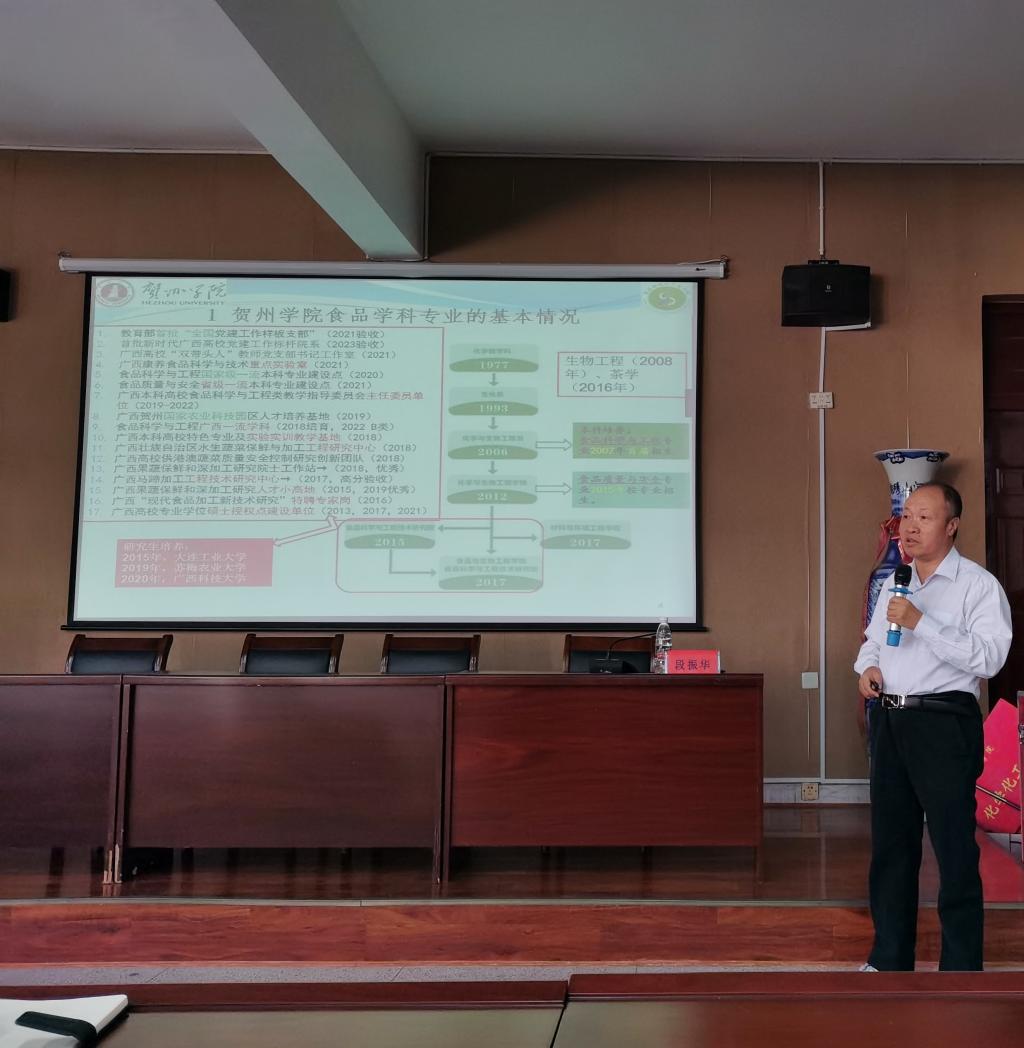 为了响应学校应用转型发展号召、加快推动药生学院学科、专业、课程应用转型发展速度,11月1日下午,药生学院邀请食品科学与工程国家级一流本科专业负责人、贺州学院食品与生物工程学院名誉院长段振华教授来校就学科、专业及课程建设进行交流。段教授作题为《地方本科院校一流学科一流专业建设与思考——以贺州学院食品学科专业为例》的报告。