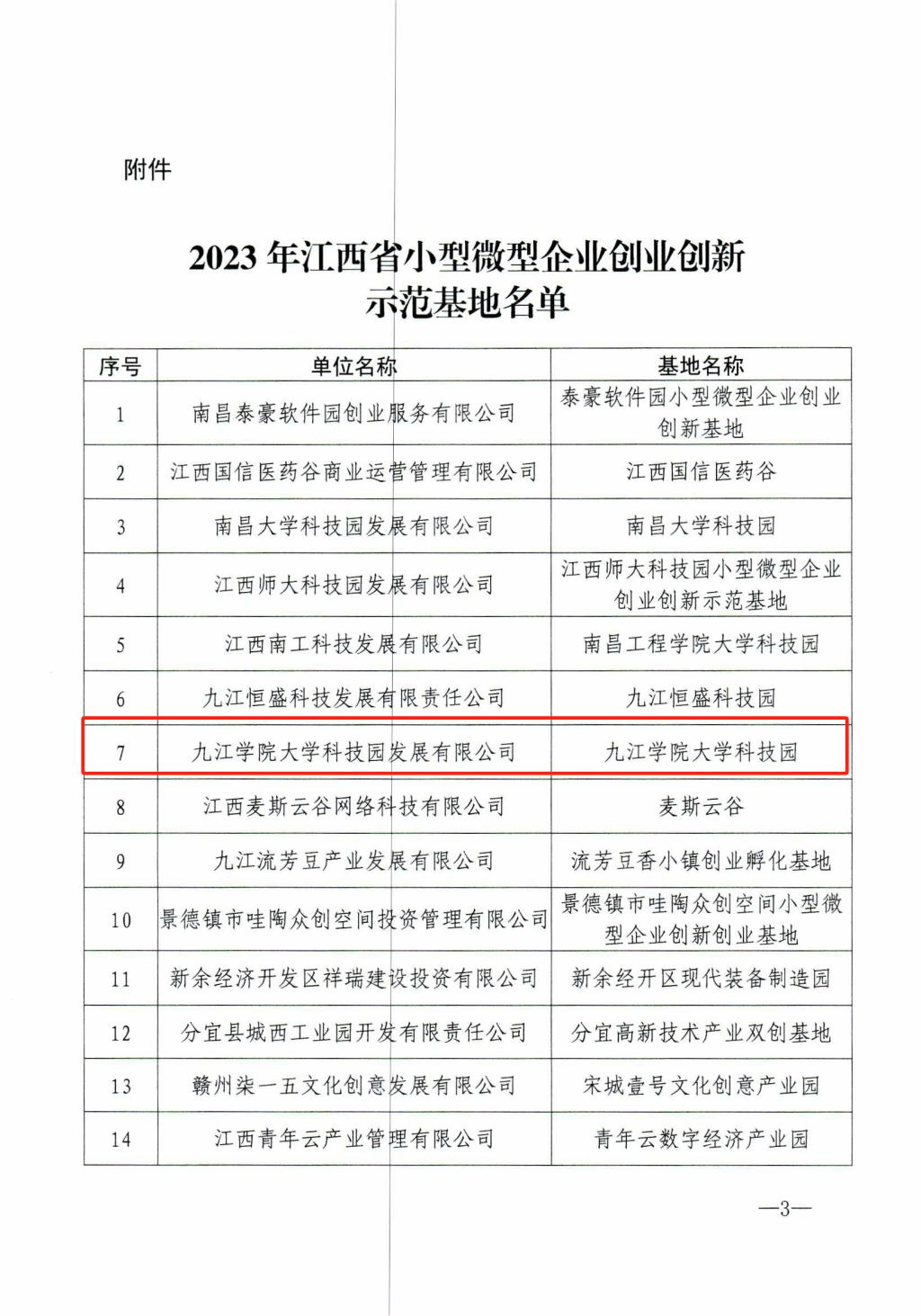 根据江西省工业和信息化厅【赣工信企业字[2023]236号】发布的2023年江西省小型微型企业创业创新示范基地名单的通知,经市级推荐、专家实地核查、公示等程序,我校大学科技园通过省工信厅确定,成功获批“江西省小型微型企业创业创新示范基地”。