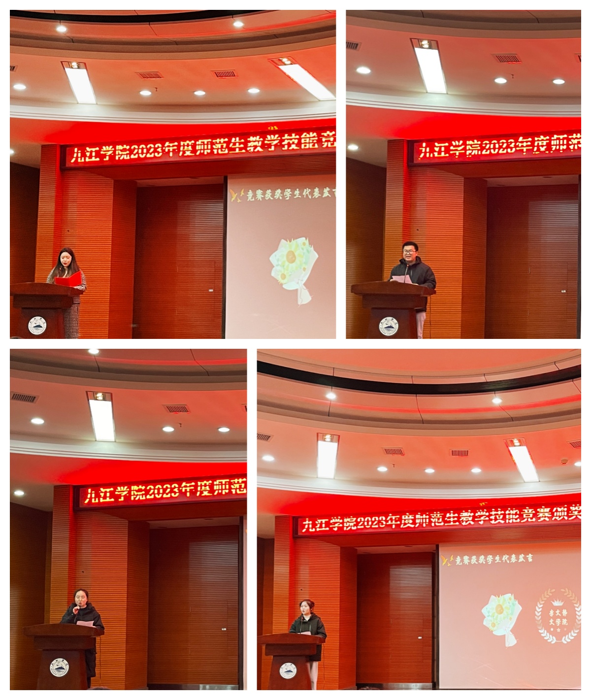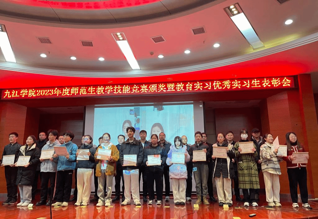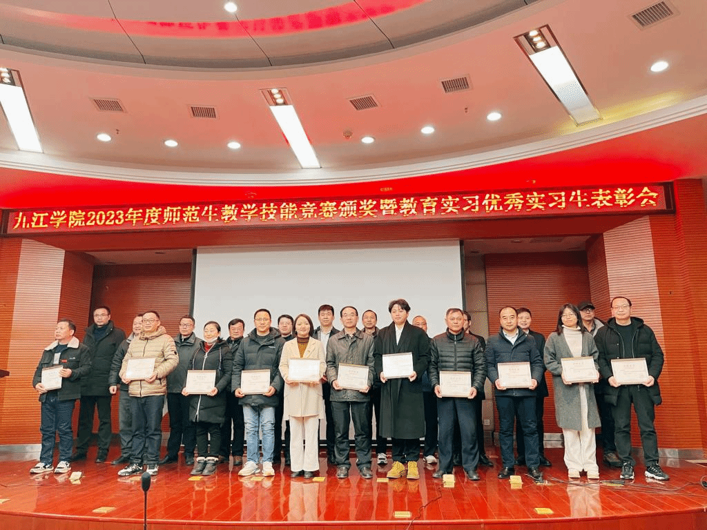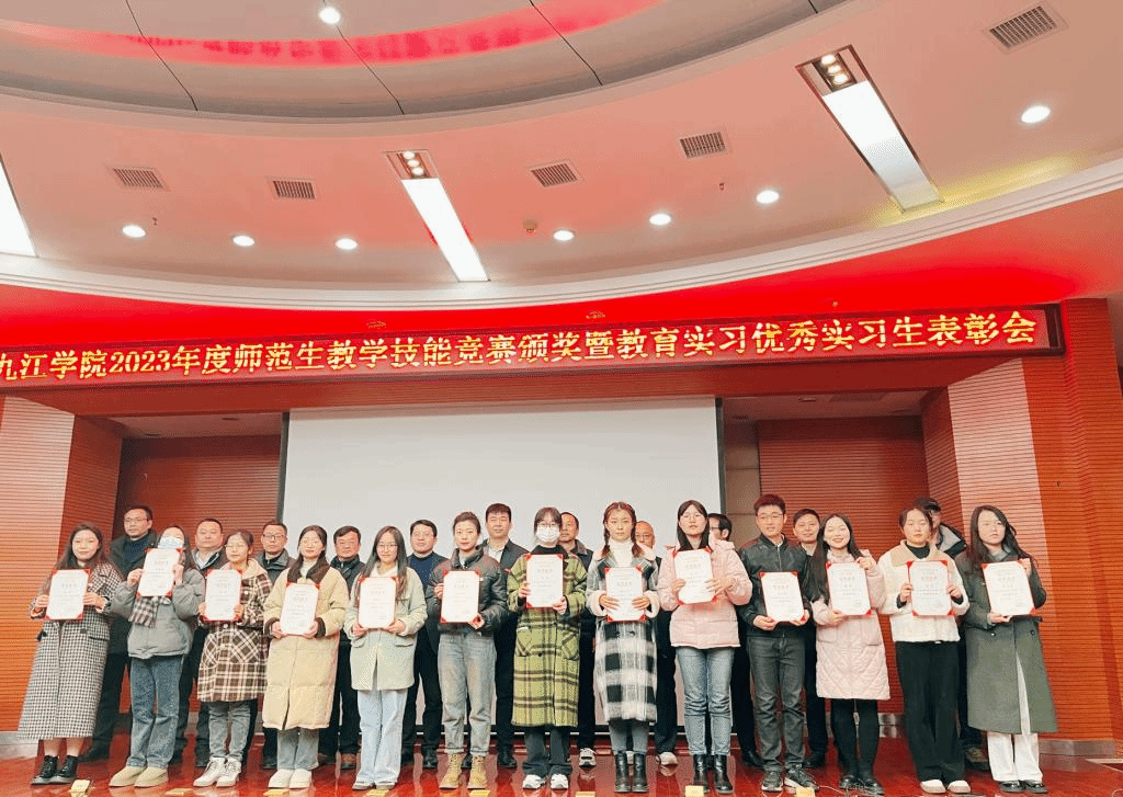 此次活动表彰了赵妍等13名九江学院2023年度师范生教学技能竞赛一等奖获得者、李欣怡等16名二等奖获得者、杨惠霖等14名三等奖获得者以及熊修春等13名优秀指导教师;同时,还表彰了在2023年教育实习中荣获“优秀实习生”称号的65名同学。