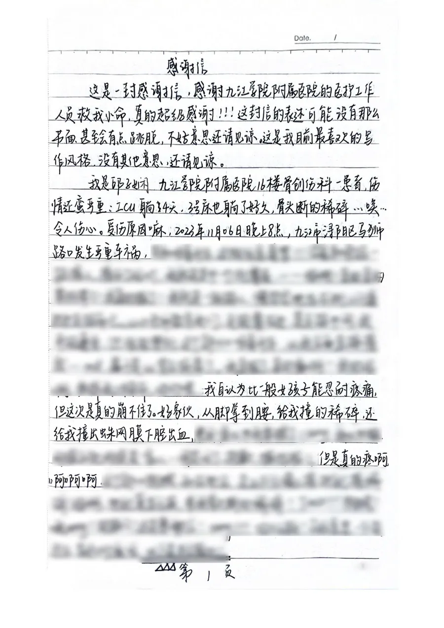 她在信里写道:“我超级无敌感谢九江学院附属医院16楼骨创伤科全体医护人员!也感谢一楼ICU急诊科的全体医护人员,还有康复科的医生和实习生小妹妹们!真的超级感谢,感谢救助!感谢照顾!感谢鼓励!真的感谢!”随性俏皮的文风,却满是真情实感,也能看出,长时间的住院,她早已与医护处成朋友。
