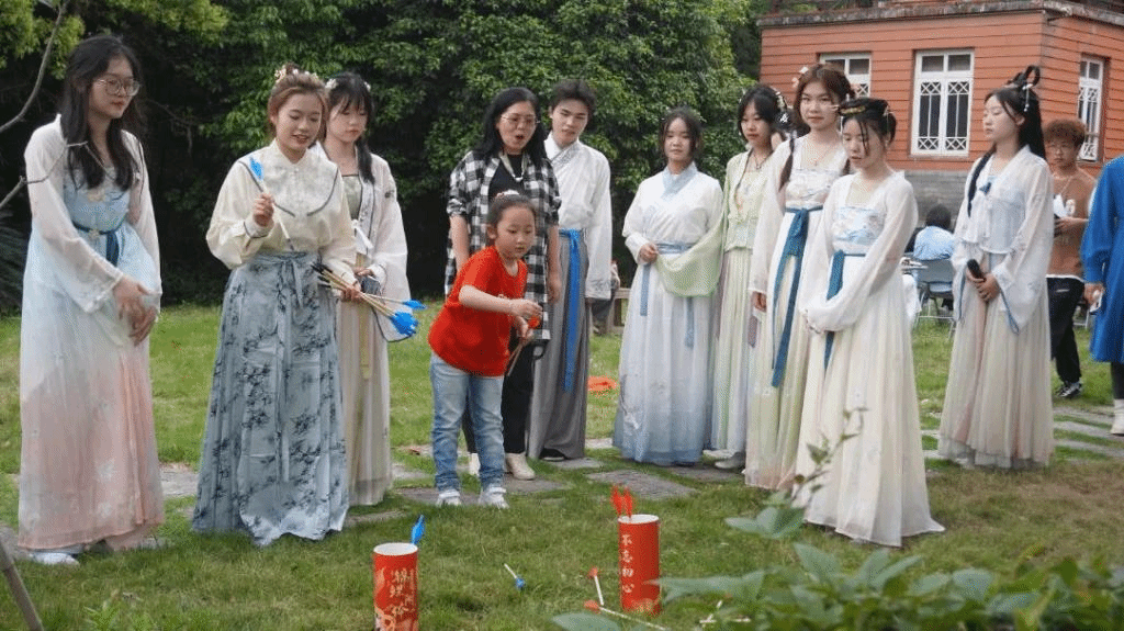 诗会还设置了户外投壶游戏及谷雨心愿贴DIY制作体验项目,带领参与者解锁不一样的诗会新玩法,感受独特的春日体验。来自九江市妇儿家教指导中心的孩子们和师生们一起观赏了诗会,参加了游戏。