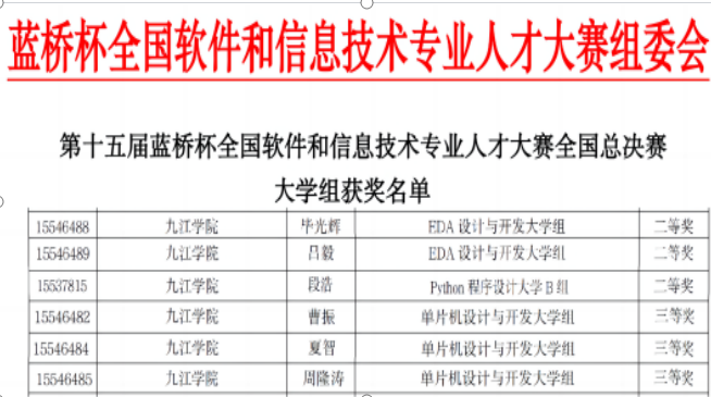 近日,第十五届蓝桥杯全国软件和信息技术专业人才大赛落下帷幕,我校电子信息工程学院学子凭借出色的表现,一举斩获多项荣誉,其中全国二等奖3项,全国三等奖3项,全国优秀奖5项。