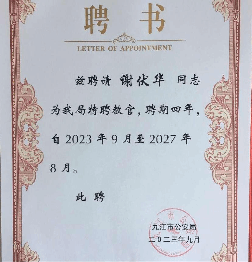 谢伏华博士被九江市公安局聘为“特聘教官”