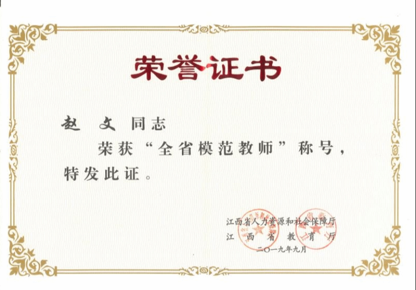 2019年,副院长赵文博士荣获“全省模范教师”称号