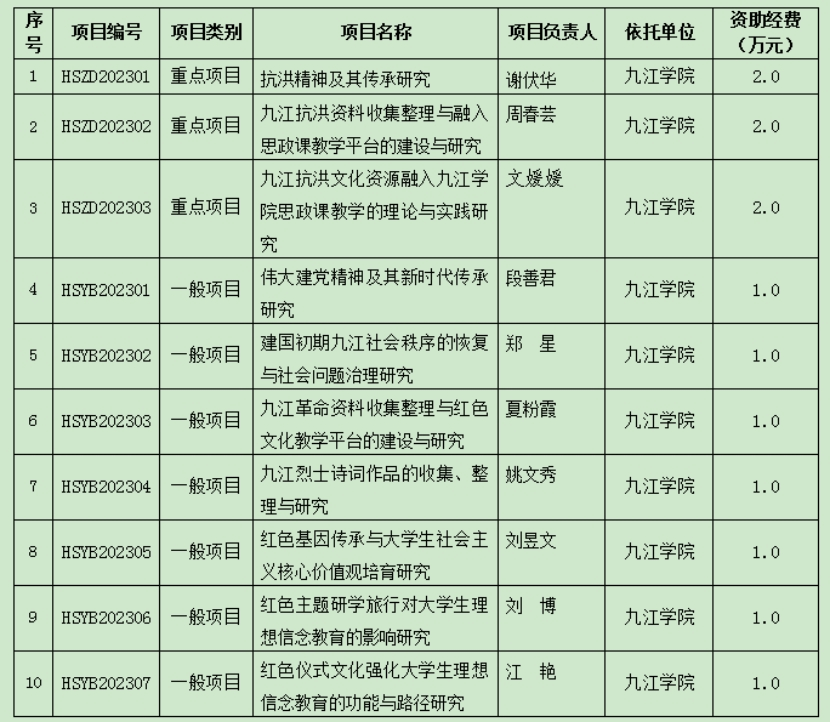 2023年九江学院九江红色文化研究中心专项研究课题立项项目汇总表