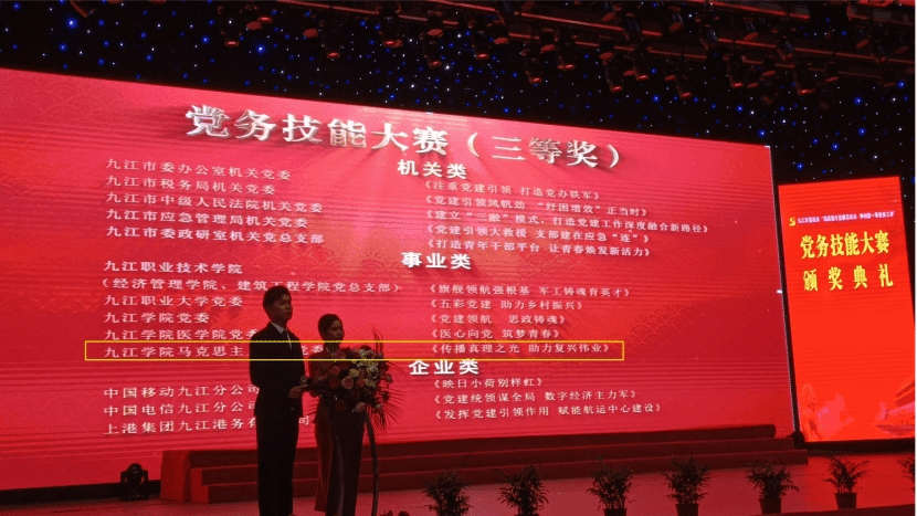 2022年,学院党建工作案例《传播真理之光 助力复兴伟业》荣获九江市直机关“高质量打造模范机关,争创第一等党务工作”党务技能大赛三等奖
