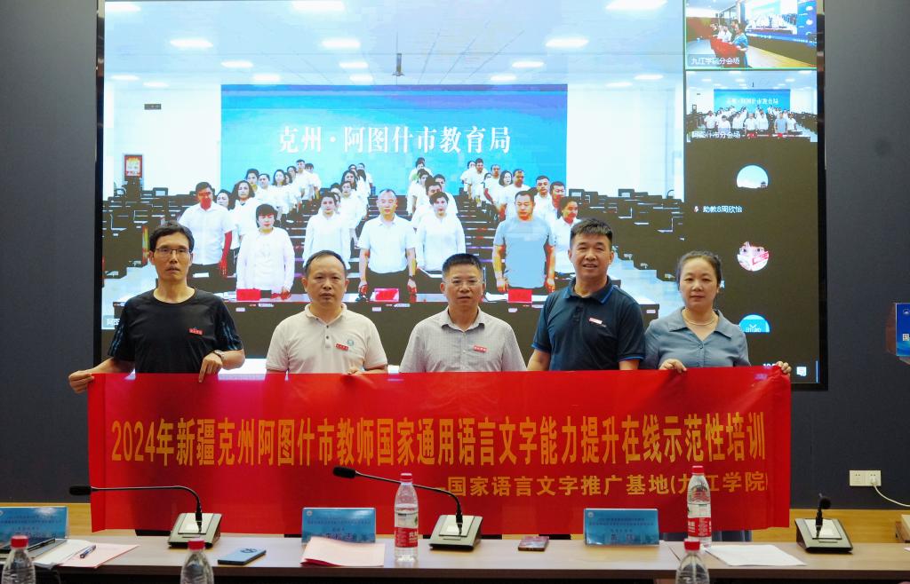 8月17日,我校举行国家语言文字推广基地对口新疆克州阿图什市教师国家通用语言文字能力提升在线示范培训班开班仪式。开班仪式以线上、线下相结合的方式同步举行。副校长、国家语言文字推广基地(九江学院)副主任李松志,阿图什市教育局党组书记、副局长马金龙出席开班仪式并讲话。