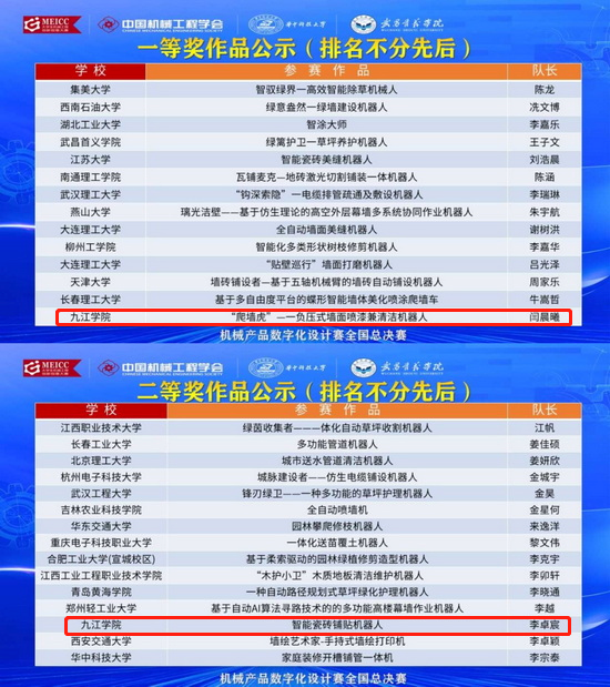 近日,2024年中国大学生机械工程创新创意大赛第13届机械产品数字化设计赛全国总决赛圆满落幕。来自西安交通大学、同济大学、南昌大学等62所高校的145支队伍展开了智慧与创意的较量。我校机械与智能制造学院学子的作品在激烈的竞争中脱颖而出,由王新海、胡云堂老师指导,学生闫晨曦、杨兆年、黄炜旺的《“爬墙虎”——负压式墙面喷漆兼清洁机器人》作品荣获大赛决赛全国一等奖;江卓达、吴昊老师指导,学生李卓宸、冯浩、徐冰洋的《智能瓷砖铺贴机器人》作品荣获大赛决赛全国二等奖。