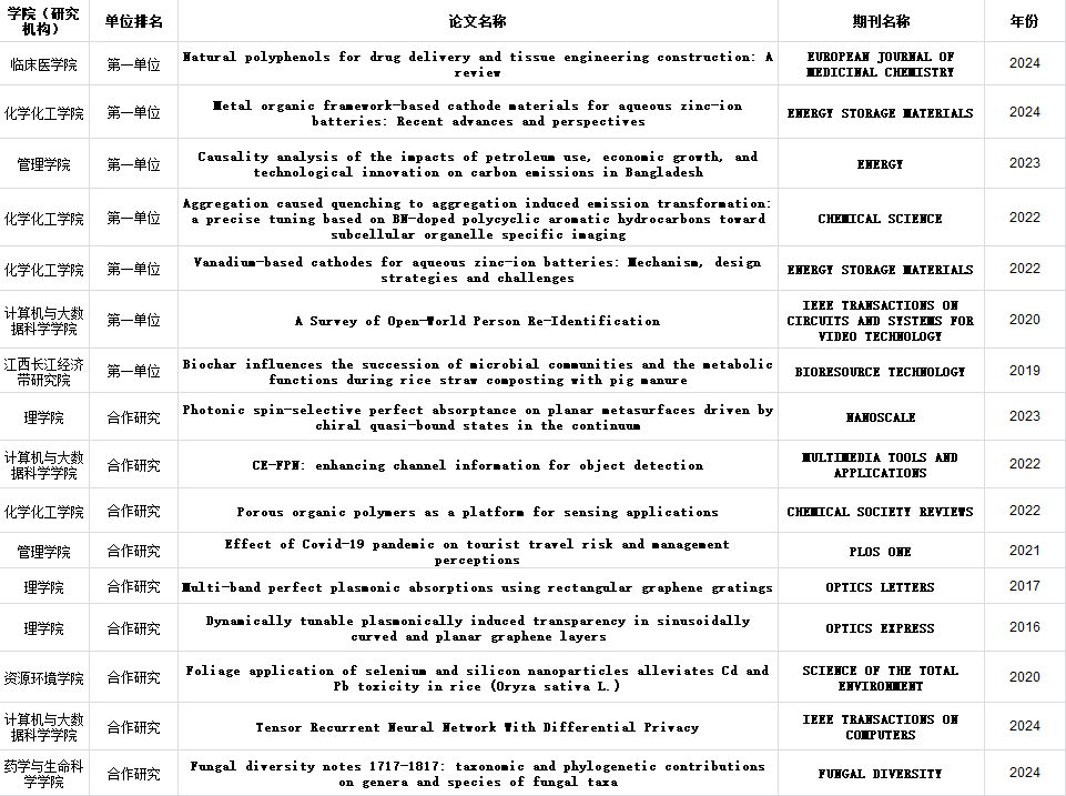 我校入选ESI的论文共计16篇,其中作为第一单位共发表7篇: