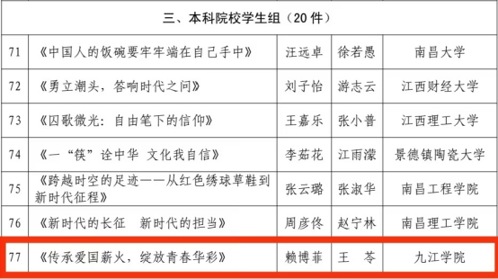 为学习贯彻习近平新时代中国特色社会主义思想、党的二十届三中全会精神和全国教育大会精神,我校积极参加由中共江西省委教育工委、共青团江西省委联合主办的第八届江西省学校共青团“微团课”大赛。比赛中,由我校文学院王苓老师悉心指导、赖博菲同学精心创作的作品《传承爱国薪火,绽放青春华彩》,在激烈的角逐中脱颖而出,荣获大赛三等奖。