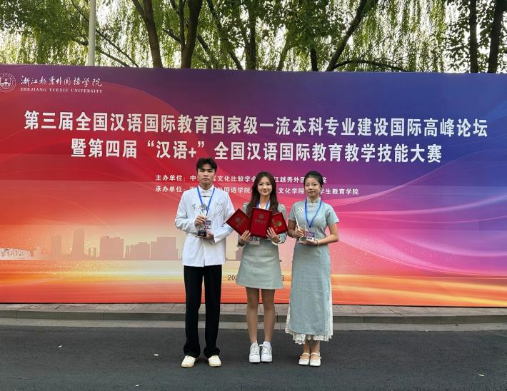 10月26日,“第三届汉语国际教育国家级一流本科专业建设国际高峰论坛暨第四届‘汉语 +’全国汉语国际教育教学技能大赛”在浙江越秀外国语学院圆满落幕。在本次大赛中,我校汉语国际教育学子表现卓越,尤其是漆文康同学在文学院教师程国珍、吴舒雅的指导下,凭借强实力斩获特等奖,这一成绩刷新了我校在该项赛事中的纪录!此外,王慧琳同学获一等奖,指导老师是钟佳艺、熊育兰;雷映同学获三等奖,指导老师为郭凤花、蔡勇。